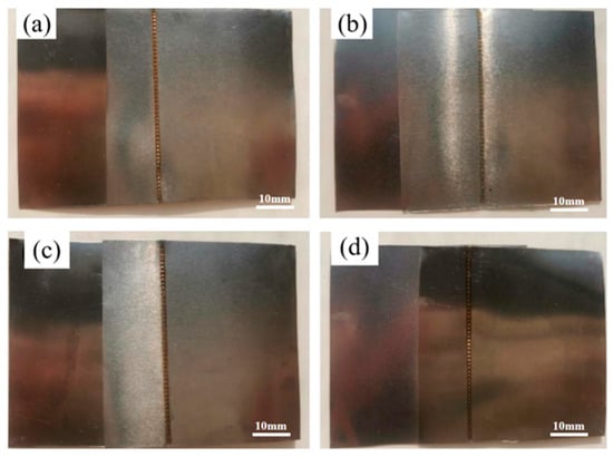 Figure 20. Surface morphology of weld seam with different clamp-applied fixed stress spans: (a) Case 2; (b) Case 8; (c) Case 9; (d) Case 10.