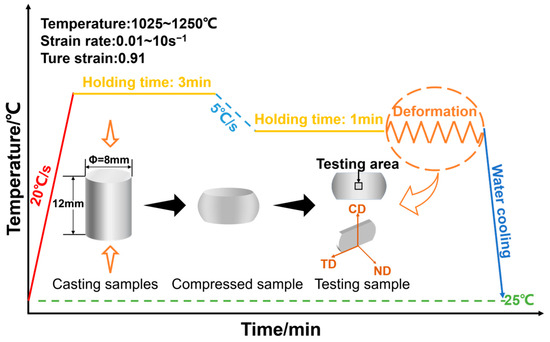 The experimental material is cast XM-19 SASS, and its chemical composition was determined using a direct reading spectrometer (OBLF-QSN750, OBLF Corporation, Dortmund, Germany), as shown in Table 1. After vacuum smelting and casting, the test steel underwent homogenization treatment by being held at 1190 °C for 23 h and then water-cooled to room temperature to obtain a single austenitic structure. The homogenized test steel was cut into 8 mm × 12 mm cylindrical compressed samples by wire cutting, and the surface was ground to improve the surface quality of the samples. The hot compression test was then conducted using the Gleeble-1500 thermal simulation testing machine (DSI, St. Paul, MN, USA). Figure 1 shows the process flow of the XM-19 SASS hot compression test, along with a schematic diagram of the sample’s hot deformation process.