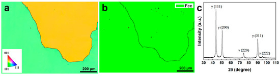 Figure 2 shows the microstructure and XRD result of XM-19 SASS before hot deformation. The microstructure reveals that it consists of coarse grains, and the grains exhibit a single orientation feature (Figure 2a). Analysis of the PH diagram (Figure 2b) and XRD pattern (Figure 2c) confirms that the material has a single austenitic structure before hot deformation.