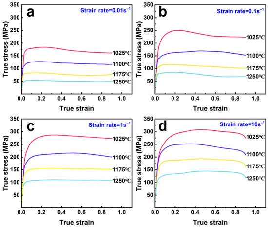 The true stress–strain curves of XM-19 SASS at different strain rates: (a) 0.01 s−1; (b) 0.1 s−1; (c) 1 s−1; (d) 10 s−1.