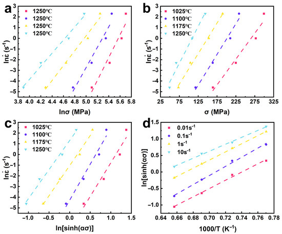 The flow stress values of XM-19 SASS under the true strain of 0.7 (Table 2) were used to ascertain the parameters of the constitutive equation in this investigation. According to Equation (7), in the case of a constant deformation temperature, the values of n1 and β are determined by the linear relationships between and , respectively. The slopes of the four lines in Figure 4a,b correspond to n1 and β, yielding values of n1 = 8.32645 and β = 0.057963, with α = 0.006962 obtained.