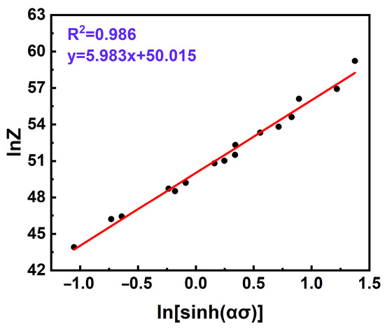 The calculated Q value of thermal activation energy is substituted into Equation (10) to obtain the corresponding Z value. The scatter plots are drawn according to Equation (11), and its linear relationship is shown in Figure 5. The slope of the linear regression fitting line is the value of n2, and the calculated result is 5.9829, which is close to the above-mentioned value of n. Furthermore, the A value can be obtained by the intercept of the fitting straight line, and the calculation result is 5.456 × 1021. The calculated n2 value in this study is greater than 5, and combined with the thermal deformation activation energy, it indicates that the main deformation mechanism is screw dislocation cross-slip driven by local stress and assisted by thermal activation [31,32,33].