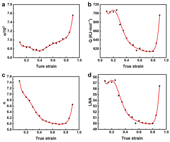 Equation (11) is an Arrhenius constitutive equation based on flow stress, strain rate and deformation temperature under the condition of 0.7 true strain. Nevertheless, this equation fails to illustrate the influence of strain on the flow stress of the alloy [34]. Through the study of XM-19 SASS, it is found that material constants α, Q, n and lnA all decrease at first and then increase with the increase in strain, as shown in Figure 6. Therefore, the influences of strain, compression speed, and deformation temperature are crucial considerations in creating an accurate constitutive model in order to more precisely forecast the alloy’s flow stress. The material constant value in the true strain range of 0.1–0.9 is found in this study by repeating the same calculation steps with 0.05 as the strain increment. The eight-quintic polynomial function is used to fit the material parameters. The coefficients of the polynomial function of the fitting results are shown in Table 4. The fitted polynomial equations are as follows: