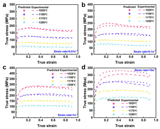 The comparison between experimental and predicted results: (a) 0.01 s−1; (b) 0.1 s−1; (c) 1 s−1; (d) 10 s−1.