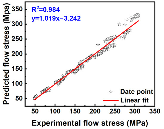 In the above Equations (14)–(16), , , and represent the experimental and average experimental flow stress values, and the predicted and average predicted flow stress values, respectively, as N represents the number of data points. As shown in Figure 8, the predicted value of the constitutive model has a good positive correlation with the experimental data, as seen by the fitted straight line’s slope of 0.984, near to 1. The calculated R, AARE and RMSE are 98.51%, 3.92% and 4.84%, respectively, indicating that the actual data and the predicted outcomes of the constructed constitutive model are extremely consistent, and can effectively reflect the flow stress change of XM-19 SASS under thermal deformation conditions.