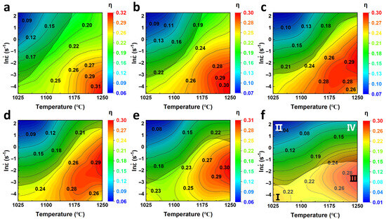 Hot processing maps of XM-19 SASS under different strain conditions: (a) 0.4; (b) 0.5; (c) 0.6; (d) 0.7; (e) 0.8; (f) 0.9.