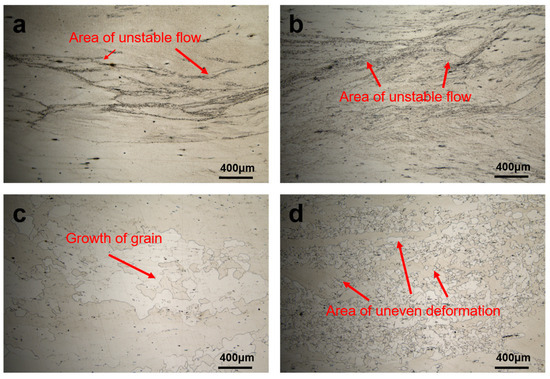 The microstructure of several regions in the XM-19 SASS hot processing map at a real strain of 0.9 is displayed in Figure 10. As observed in Figure 10a, the hot deformation of XM-19 SASS in Zone II shows flow instability (red arrows). Under this deformation condition, the grains are elongated to form a necklace structure, with a small amount of discontinuous dynamic recrystallization appearing at the grain boundary. Combined with Figure 9f, it becomes evident that the power dissipation factor in Zone II is the lowest, in the dangerous area of hot working. In this zone, hot working is likely to cause unstable flow, leading to affecting material forming stability. Although the low temperature and low-rate zone (Zone I) is located in the safe processing area, similar to Zone II, there is still unstable flow. This may be because DRX is not enough to reduce stress concentration, resulting in unstable local flow. Zone III facilitates the growth of recrystallized grains and is advantageous for the occurrence of DRX, as shown in Figure 10c. Following growth, the original austenite grains are entirely taken over by the recrystallized grains. The power dissipation factor of material reaches its maximum value at this point. Figure 10d shows the dangerous processing area (Zone IV) at high temperatures and high strain rates. Within the context of this particular scenario, although the recrystallization rate is the highest, due to the formation of a mixed structure of substantial deformation grains along with DRX grains, hot working may lead to an uneven microstructure in the material, which is not conducive to subsequent processing.