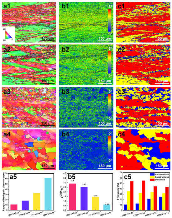 IPF maps, KAM maps and GOS map of XM-19 SASS at the strain rate of 0.1 s−1 and different temperatures. (a1–c1)1025 °C; (a2–c2) 1100 °C; (a3–c3) 1175 °C; (a4–c4) 1250 °C; (a5) recrystallization grain size; (b5) GND values; (c5) GOS values.