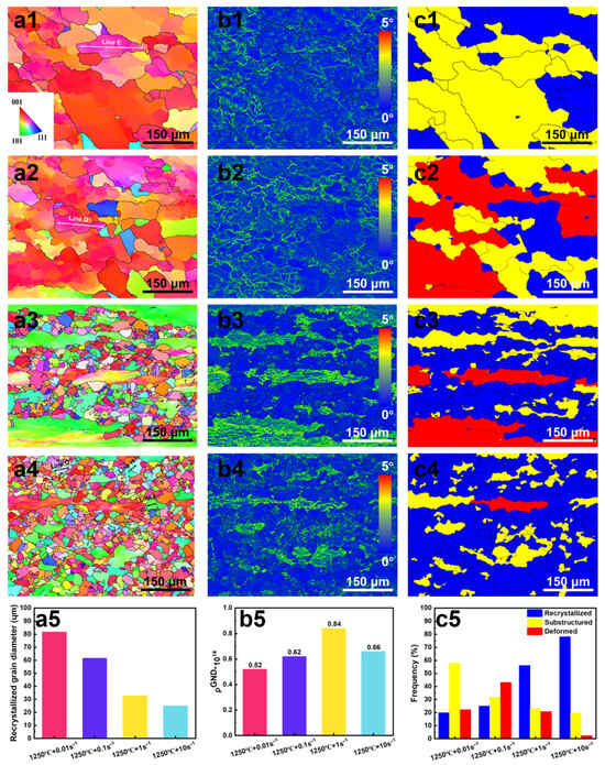IPF maps, KAM maps and GOS maps of XM-19 SASS at the compression temperatures of 1250 °C and strain rates. (a1–c1) 0.01 s−1; (a2–c2) 0.1 s−1; (a3–c3) 1 s−1; (a4–c4) 10 s−1; (a5) recrystallization grain size; (b5) GND values; (c5) GOS values.