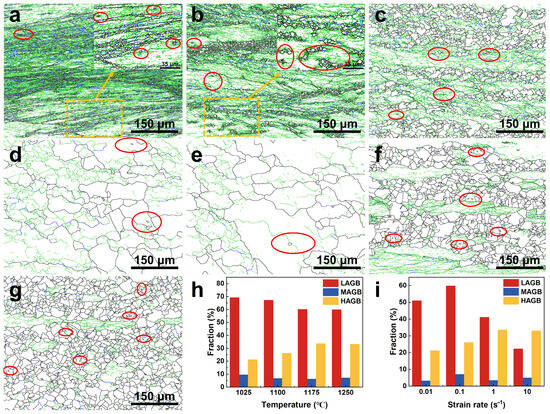 Boundary maps of the XM-19 SASS under different deformation conditions: (a) 1025 °C, 0.1 s−1; (b) 1100 °C, 0.1 s−1; (c) 1175 °C, 0.1 s−1; (d) 1250 °C, 0.1 s−1; (e) 1250 °C, 0.01 s−1; (f) 1250 °C, 1 s−1; (g) 1250 °C 10 s−1; (h,i) the fraction of LAGBs.