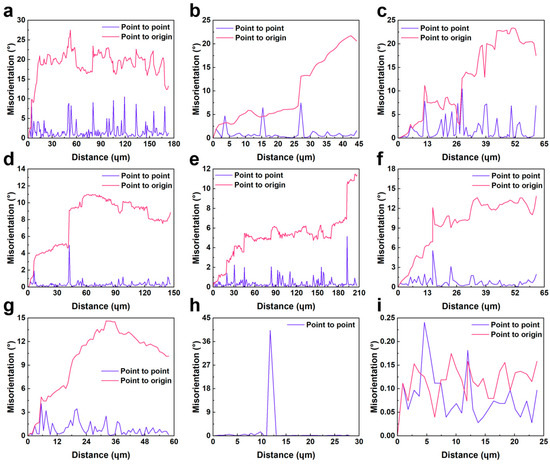 Figure 14 shows the internal orientation difference of crystal grains measured along the mark lines in the IPF maps of Figure 11 and Figure 12. As can be seen in Figure 14a–g, the cumulative orientation deviation in sub-grains increases rapidly, and some of them exceeded 15°. The increase in the cumulative orientation deviation indicates that sub-grain rotation occurs inside the grains during deformation, and that LAGBs and MAGBs inside the grains will absorb dislocations and form HAGBs [46]. With the continuous formation of HAGBs in the deformed grains, fine DRX grains are formed, which further proves that CDRX exists in XM-19 SASS during thermal deformation. In addition, as shown in Figure 14h,i, it was also found that the cumulative orientation deviation between sub-grains and the adjacent recrystallization is more than 40°, while the cumulative orientation deviation between the DRX grains is very small. The above results show that during the thermal deformation of XM-19 SASS, CDRX and DDRX occur at the same time, with DDRX as the main process and CDRX as the auxiliary.