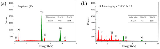 Figure 4 depicts the microstructures of the 3# specimen after heat treatments. Given the near-equiatomic composition of the specimen (close to 1:1), after solution and aging treatments, the matrix predominantly consists of the B2 austenite phase at room temperature. Evidently, precipitates also emerge and are predominantly distributed at the grain boundaries upon aging. The size of these precipitates gradually increases with the increase in either the aging temperature or the aging time. Comparing the EDS results shown in Figure 5 and the XRD results in Figure 6 with the precipitates in the SEM images, it can be determined that these precipitates are Ti2Ni phases [33,34].