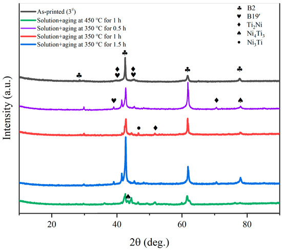 The XRD results presented in Figure 6 indicate that the as-printed 3# specimen primarily comprises the B2 austenite phase, accompanied by minor fractions of the B19′ martensite and Ti2Ni phase. These phases can be seen in Figure 3 and Figure 4 as lamellar austenite, finely striated martensite, and spherical Ti2Ni particles, respectively [33,34]. The phase composition of the Ni–Ti SMA foam undergoes significant changes after heat treatments. After solid solution treatment and aging at 450 °C for 1 h, the intensity of the diffraction peak of the B2 phase decreases, whereas the intensity of the diffraction peak of the B19′ phase increases, and a small amount of Ni3Ti phase and Ni4Ti3 phase emerge. After solid solution treatment and aging at 350 °C for 0.5 h, the intensity of the diffraction peak of the B19′ phase increases. The Ni4Ti3 phase also emerges, and as the aging time is extended, the intensities of the diffraction peaks of both the Ni4Ti3 and Ti2Ni phases increase [35]. According to the literature [36], the Ni4Ti3 phase grows as the aging temperature rises and the aging time lengthens, with its area proportion capable of reaching 20–30%.