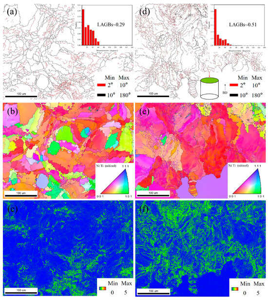 Figure 7. Images (ac) and (df) represent the grain boundary distribution, inverse pole figure (IPF), and kernel average misorientation (KAM) of the 3# specimens before and after heat treatment (solid solution treatment + aging at 350 °C for 1 h), respectively.