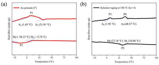 Figure 9 presents the thermal analysis results of the 3# specimen before and after heat treatments. It can be observed that the as-printed 3# specimen displays a one-step phase transformation of B19′ → B2 during the heating process, with only one endothermic peak P1 emerging. Conversely, a single exothermic peak P2 appears during cooling, which is attributed to the one-step B2 → B19′ phase transformation. Significant changes take place after heat treatments: the phase transformation characteristic temperatures shift toward the high temperature side, and a two-step phase transformation occurs during the heating process. The first endothermic peak P3 corresponds to the transformation of B19′ → R, and the second endothermic peak P4 corresponds to the transformation of R→B2. However, only a single exothermic peak P5 emerges during cooling, corresponding to the one-step B2 → B19′ phase transformation. The two-step transformation during the heating process can be attributed to the fact that the obstructive effect of the Ni4Ti3 phase precipitated during aging on the B2 → B19′ transformation is much stronger than that on the B2 → R transformation, due to the considerably larger transition strain of the former [39]. The precipitation of the Ni-rich precipitated phase in the matrix during the aging treatment results in a decrease in the Ni content in the matrix, thereby increasing the phase transformation temperatures. Notably, according to the binary alloy phase diagram of Ni–Ti, both the Ti2Ni and Ni4Ti3 phases remain stable within the temperature range of the DSC test. This means that the presence of these two phases has no influence on the appearance of the peaks in the DSC curves.