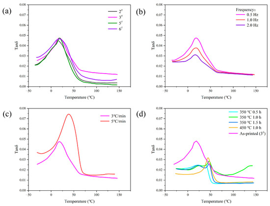 Figure 10. Damping behaviors of Ni–Ti SMA foams: (a) as-printed 2#, 3#, 5#, and 6# specimens; (b) effect of measuring frequency on the damping behavior of 3# specimen; (c) effect of heating rate on the damping behavior of 3# specimen; (d) damping behavior of 3# specimen in different states.