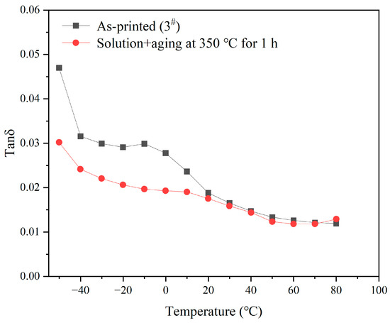 The damping behaviors of Ni–Ti SMA foams during heating are depicted in Figure 10. The damping curves of the 1# and 4# specimens are not presented as their damping data were unreliable; this is because they experienced deformation under the clamping action of the fixture during damping testing using DMA due to their thin rod diameter. From Figure 10a, it is observed that a damping peak emerges. From Figure 10b,c, it is evident that this damping peak increases with a decrease in the measuring frequency or an increase in the heating rate, exhibiting a typical characteristic of first-order phase transformation [39]. In combination with the DSC result shown in Figure 9a, it can be determined that this damping peak originates from the reverse martensitic phase transformation. From Figure 10a, it can also be noticed that the damping approximately increases with the decrease in RDCS (rhombic dodecahedron cell size) or the increase in rod diameter. This is because the high damping of Ni–Ti SMA foams mainly originates from the inherent damping of the Ni–Ti matrix. Although pores also have a damping effect, the relative content of the Ni–Ti matrix should be the dominant factor for the damping peak arising from the phase transformation from martensite to austenite. Figure 10d shows the damping of the 3# specimen in different states. It can be seen that the damping of the specimen significantly decreases after heat treatments, which is related to the appearance of precipitated phases during the aging process. These precipitated phases can effectively pin various phase interfaces, reducing their mobility and thus lowering their energy dissipation capacity. At 350 °C, as the aging time increases, the damping first increases and then decreases. This is because when the aging time is relatively short, the precipitated phases are small and dispersed [40], so their pinning effect on various phase interfaces is the strongest. As the aging time prolongs, the precipitated phases gradually grow and are inhomogeneously distributed [41]. In some areas, the pinning force on the phase interfaces decreases, resulting in a slight increase in damping. However, as the aging time continues to prolong, the amount of precipitated phases increases significantly, which further leads to a decrease in damping.