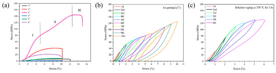 Figure 12. (a) Quasi-static compressive stress–strain curves of various specimens; superelasticity of (b) specimen 3# and (c) heat treated specimen 3#.
