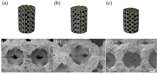 Figure 2 presents the macroscopic and microscopic morphologies of the SLM specimens with different parameters. It can be observed that the SLM method exhibits a high level of controlling precision over the dot matrix structure of the Ni–Ti SMA foam. However, a small quantity of adhesive powder is present on the surface of the component stubs. This is attributed to the fact that when the laser scans the structural contour, the surrounding area of the molten pool partially melts due to the high temperature, causing the powder to adhere to the outer edge of the stubs. No evident defects such as cracks or holes can be detected, and the size of the rod diameter varies significantly with different parameters.