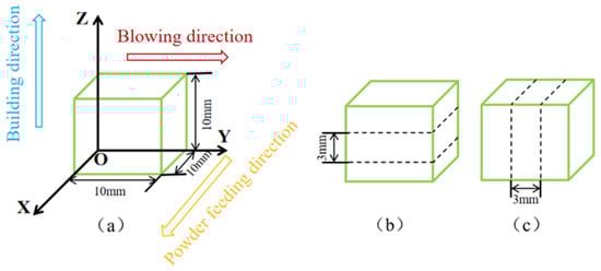 Deposition strategy and sampling schematic: (a) sample deposition schematic (b) along (XOY plane) and (c) perpendicular to building direction (YOZ plane).