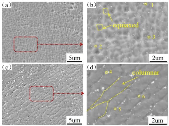 SEM images of NiCoCrW (K447A) superalloy microstructural characterisation: (a,b) XOY plane; (c,d) YOZ plane.