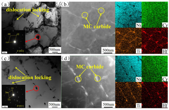 TEM and EDS imaging of NiCoCrW (K447A) superalloy: (a,b) XOY plane; (c,d) YOZ plane.