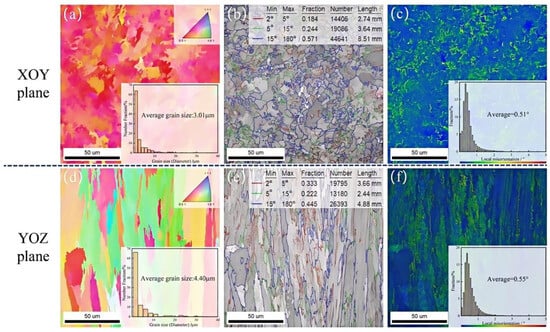 The inverse pole figure (IPF) maps in Figure 5a,d show that the grains in the XOY plane tend towards orientation, while the grains in the YOZ plane are also close to orientation. The illustrations in Figure 5a,d demonstrate that the average grain size in the XOY plane is 3.01 μm, while in the YOZ plane, it is 4.40 μm. Consistent with the SEM and TEM observations, the grain size in the XOY plane is finer. The grain boundary maps in Figure 5b,e show that the XOY plane has a larger grain boundary area due to its finer grains. The kernel average misorientation (KAM) maps in Figure 5c,f indicate a higher local stress concentration in the YOZ plane than that in the XOY plane.