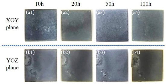 Figure 6 shows the surface macromorphologies of the XOY and YOZ planes after hot corrosion. The samples with different build directions exhibit different degrees of hot corrosion. After 10 h of hot corrosion, the YOZ samples showed extensive bulging on the surface, while the XOY plane remained relatively flat. After 20 and 50 h of hot corrosion, the surface roughness of the XOY plane remained relatively unchanged, whereas that of the YOZ plane specimens increased with corrosion time. After 100 h of hot corrosion, the corrosion layer on the XOY plane exhibited a better bond with the matrix, whereas the bulging parts on the YOZ plane experienced severe spalling.