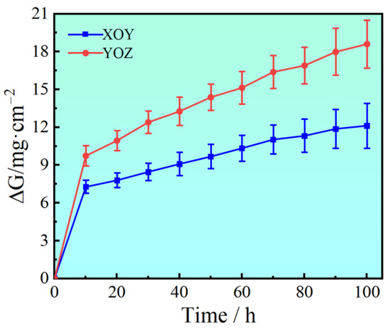 The kinetic curves of the studied superalloy after corrosion for 100 h in molten Na2SO4 at 900 °C are shown in Figure 7. The mass gain due to hot corrosion at every stage on the YOZ plane is consistently higher than that on the XOY plane. After 100 h of corrosion, the unit area mass gains for the studied superalloy on the XOY and YOZ plane samples are 12.13 mg/cm2 and 18.56 mg/cm2, respectively. The average corrosion rate of the YOZ plane is 1.5 times that of the XOY plane. The hot-corrosion kinetics of the studied superalloy follows the parabolic law, and the hot-corrosion rate of the studied superalloy is represented by Equation (2) [26,27]. By comparison to other used nickel-based superalloys [18,20], both the XOY and YOZ plane samples demonstrate superior resistance to hot corrosion. The superior hot-corrosion resistance of nickel-based superalloys prepared by SLM is attributed to their better microstructural stability at high temperatures. These findings imply that the studied superalloy is well suited for applications demanding high hot-corrosion resistance.
