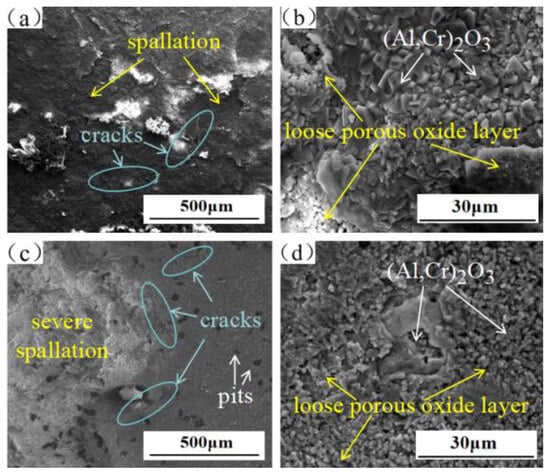Surface morphologies of specimens after hot corrosion at 900 °C for 100 h with Na2SO4: (a,b) XOY plane; (c,d) YOZ plane.