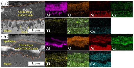 SEM images of the cross-sections of corresponding EDS after hot corrosion at 900 °C for 100 h with Na2SO4: (a) XOY plane; (b) YOZ plane.