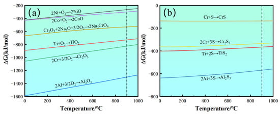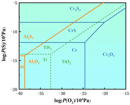 The reaction between S and alloy elements is shown in reaction (6). The standard Gibbs free energy of metal sulphides at 900 °C follows the order Al2S3 < TiS2 < Cr2S3 < CrS, as shown in Figure 11b. Therefore, S reacts preferentially with Al. When Al is consumed to a certain extent, Ti reacts with S, and eventually, Cr undergoes sulphidation. As shown in Figure 12, metal sulphides can form oxides by reacting with O2 (Reaction (7)) when the O2 partial pressure is sufficiently high. S and O2 have a synergistic effect in the hot-corrosion process. As shown in reaction (3), the O2 entering the corrosion layer and the O2 released from Na2SO4 together lead to an increase in the oxygen partial pressure in the matrix, promoting the oxidation of metal sulphides.