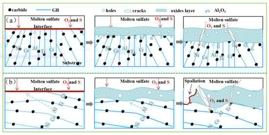 The hot-corrosion schematic of the studied superalloy in Na2SO4 at 900 °C is shown in Figure 13. S and O2 diffuse through the grain boundaries into the matrix, where they selectively react with alloying elements. TiC and HfC precipitate at the grain boundaries, and these carbides exhibit high stability. Moreover, Hf and Ti have higher oxidation resistance than Al, Ni, and Co. As shown in Figure 4, the area fraction of carbides on the XOY plane is larger, effectively slowing down the hot-corrosion rate. As hot-corrosion progresses, a dense oxide film (Al2O3 and Cr2O3) forms on the sample surface. Due to the low solubility of Na2SO4 in this oxide film, it acts as a protective barrier to the matrix, reducing the rate of hot corrosion. The finer grain size and more uniform distribution of carbides on the XOY plane result in a lower local stress concentration than that in the YOZ plane, contributing to the structural stability of the oxide film. The grain refinement increases the uniformity of the microstructure, reducing local stress and decreasing defects at the grain boundaries, which in turn reduces the diffusion paths for corrosive media. A higher carbide area fraction pins the grain boundaries, preventing slippage and promoting the formation of a dense oxide film, thereby enhancing the resistance to hot corrosion. The uniform distribution of carbides allows the matrix to deform more uniformly, reducing local stress and improving the adhesion of the oxide film, thus reducing spalling behaviour. These factors collectively act to significantly reduce the rate of hot corrosion and enhance the hot-corrosion resistance. The dissolution of Cr2O3 can lead to the formation of holes or cracks in the corrosion layer (reaction (8)). S and O2 can then diffuse through these defects to the substrate surface, where they react with the matrix, leading to further hot corrosion. Therefore, the matrix is primarily protected by the Al2O3 layer. As shown in Figure 5f, the YOZ plane exhibits greater local stress, leading to poor adhesion between the corrosion layer and the matrix. After the severe spalling of the corrosion layer, the matrix surface is re-exposed and reacts with S and O2 (reaction (4)–(7)), resulting in more severe corrosion on the YOZ plane.