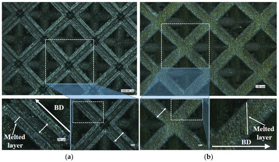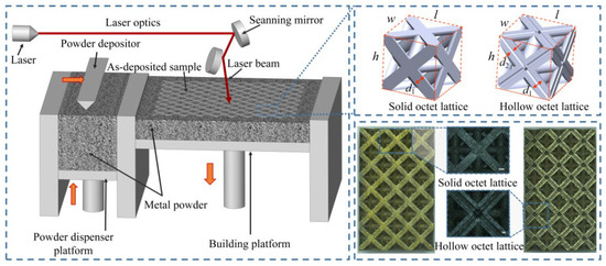 In this work, octet-truss lattice materials with a hollow truss (HT) and solid truss (ST) are designed as shown in Figure 1, whose unit cells are characterized by l × w × h = 6 mm × 6 mm × 6 mm, d1 = 1.4 mm or 1.3 mm, and d2 = 0.4 mm. A first-order approximation of the relative density can be given by for the ST and for the HT. The designed relative densities are 34% (ST) and 43% (HT), respectively. The equiatomic CoCrNi pre-alloyed powders (Xi’an Bright Additive Technologies Co., Ltd., Xi’an, China) with a spherical shape and an average size of 35 μm are employed in this work. All designed samples were manufactured by laser powder bed fusion using the BLT s200 laser printing machine (Xi’an Bright Additive Technologies Co., Ltd., Xi’an, China). This process is characterized by several key features [27]: the laser power of 180 W, the applied laser wavelengths of 1.07 μm, a laser spot size of 60 μm, a scan speed of 1000 mm/s, an overlapping rate of 50%, and the printed layers with a thickness of 40 µm. The as-fabricated octet-truss lattice materials exhibit an average relative density of 35% with a standard deviation of 0.4% for the solid truss (ST) and 44.6% with a standard deviation of 0.5% for the hollow truss (HT). The measured dimensions deviate by less than 5% from the designed values, which may be attributed to high surface roughness. Additionally, dog-bone-shaped specimens with a gauge length of 15 mm and a diameter of 3 mm were fabricated using the same manufacturing process parameters. Figure 2 shows the macro- and micro-morphologies of the laser powder bed fusion (LPBF)-manufactured octet-truss lattice materials with hollow and solid trusses. It can be observed that the staircase effect and adhered powder are found in the manufactured metallic octet-truss lattice material.