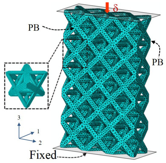 The mechanical response and failure mechanism of lattice materials subjected to compressive loading at various temperatures were studied using ABAQUS 2020. As shown in Figure 4, octet-truss lattice models were meshed with hexahedral C3D8 elements (type C3D8 in the Abaqus library). To avoid convergence issues and ensure numerical accuracy, an average element size of 0.5 mm was used, which provides a convergent load–displacement curve while maintaining efficient computational cost and simulation accuracy. All degrees of freedom of the lower plate were constrained, while all degrees of freedom except the three directions of the top plate were fixed. The top platen of the 1–2 plane was displaced in the negative 3 direction at a speed of 1 mm/min to simulate quasistatic compression. After the convergence analysis, the element size of 0.2 mm is employed to meet both computing precision and efficiency. A 3 × 5 unit cell for 25 °C, 3 × 4 unit cell for 600 °C, 2 × 2 unit cell for 800 °C in the x-y plane, and 3 × 1 unit cells in the z-y plane are employed in the simulation model to be consistent with the experimental samples. Due to the deformation symmetry of the specimen, the symmetric boundaries (PB) are imposed on the front and back of the representative model in the 1–2 plane. The friction coefficient is 0.2 in the numerical model. The basic properties of the CoCrNi alloy at different temperatures are shown in Figure 5. As the temperature rises, both the tensile strength and elongation decrease. In order to ensure quasi-static compression, the kinetic energy during the finite element simulation process is always less than the internal energy (less than 5%) throughout the compression process. In the FEM, the material was modeled as elastic-perfectly plastic, as described by its elastic modulus and yield point.