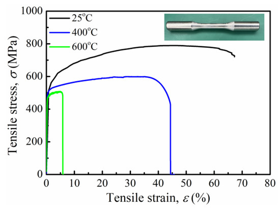 To investigate the mechanical performance of the as-designed octet-truss lattice material, quasi-static compression tests were conducted using an LE5105 electronic universal testing machine equipped with an electrical furnace (Lishi Scientific Instruments Co., Ltd., Shanghai, China). The tests were performed at a strain rate of 1 mm/min at temperatures of 25 °C, 400 °C, and 600 °C. Prior to testing, all samples were annealed in the furnace for 20 min to ensure uniform temperature distribution. During the compression tests, the load–displacement curves were automatically recorded. Engineering stress and strain were calculated by dividing the measured load and compressive displacement by the cross-sectional area and initial height of the tested samples, respectively. Simultaneously, a video camera was employed to capture the deformation process. Three as-fabricated specimens were tested to ensure repeatability. Furthermore, tensile tests of the dog-bone-shaped samples were conducted. Figure 3 illustrates the tensile stress–strain responses of the CoCrNi alloy at various temperatures, which serve as base material parameters for the simulation model. As temperature increases, the potential barrier for dislocation slips decreases, facilitating easier dislocation movement and consequently reducing the material strength. The notable decline in high-temperature plasticity can be ascribed to the inhibition of deformation-induced twinning during tensile loading, coupled with the pervasive occurrence of transgranular fracture at elevated temperatures. Notably, the plasticity of the CoCrNi printed sample significantly decreased at 600 °C, indicating the onset of high-temperature brittleness, a phenomenon commonly observed in many high-temperature alloys [28,29]. This is generally attributed to the intensified diffusion of oxygen (O) at grain boundaries at this temperature, leading to reduced grain boundary cohesion and transgranular fracture, thereby diminishing plasticity.