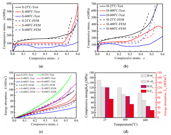 Figure 6a,b illustrate the compressive stress–strain responses of two as-fabricated octet-truss lattice materials obtained by experimental testing and numerical simulation at various temperatures. It is evident that the stress–strain curves exhibit three distinct regions, characteristic of typical cellular materials: the elastic region, a wide stress plateau region, and the densification region. In the elastic region, all octet-truss lattice materials undergo recoverable deformation, and the compressive modulus is determined by calculating the slope of this portion of the curve. Subsequently, the stress gradually increases and reaches a long and stable plateau region with slight strain hardening at 25 °C and 400 °C, indicating ductile behavior under static compressive loading. However, a minor stress drop is observed in this region for samples tested at 600 °C, attributed to strut fracture. The reason is that the plasticity of lattice material deteriorates under a high-temperature environment, which is consistent with the matrix material as shown in Figure 4. Notably, the plateau stress remains relatively smooth, making it suitable for energy absorption. As compression continues, the struts begin to come into contact with each other, leading to a sharp increase in stress, marking the onset of the densification stage. In addition, the FEM-predicted curves present reasonable agreement with the experimental curves. The comparison results further validated the accuracy of the finite element model.