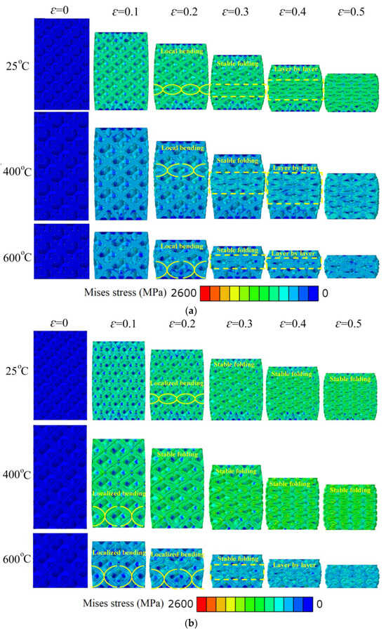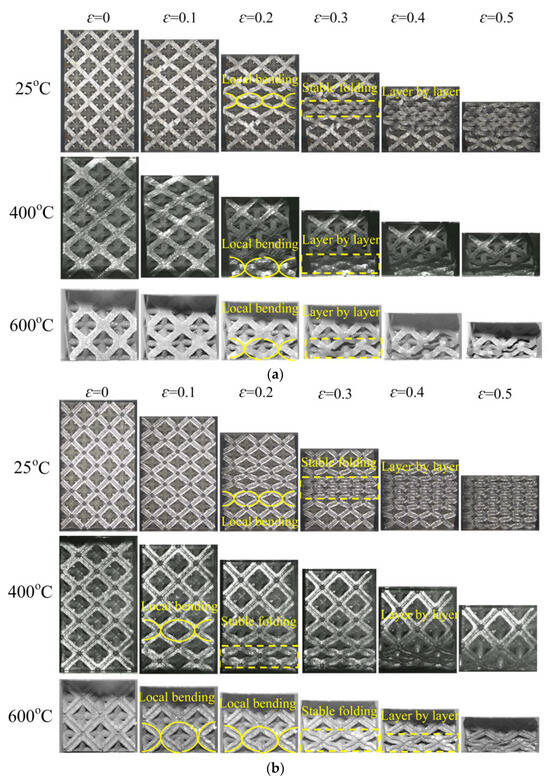 Collapse process of lattice material at different temperatures: (a) ST; (b) HT.