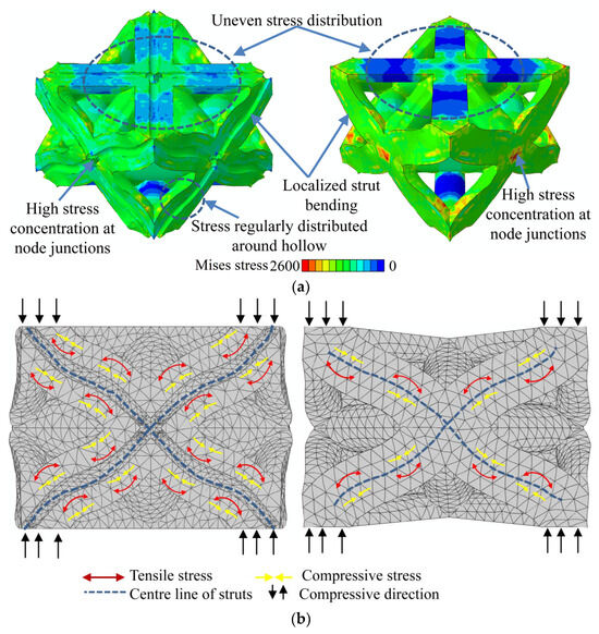 To investigate the underlying reasons for the exceptional mechanical properties of the presented metamaterial, the distributions of Von Mises stress for the ST and HT materials are compared by using unit cell representations under a compression strain of 20% in Figure 9a. As illustrated, as a typical stretch-dominated truss structure, significant and highly localized stress concentrations are observed on the struts. The high stresses are primarily localized at the inclined struts, where the largest deformations are anticipated. This can be attributed to the relatively high strut-to-node ratio. The regions surrounding the nodes are typically constrained, leading to deformation primarily occurring through the bending or twisting of the strut members. This uneven stress distribution results in a lower strain energy required for deformation, leading to severe fractures at the nodes under compression. Similarly, although the incorporation of the hollow design in HT alleviates the stress in struts to some extent, the overall stress distributions remain similar to those in ST, as the architectural configuration and the number of struts are unchanged. In addition, to further analyze the deformation behavior and stress distribution within the cross-sections of the struts, the struts on one side of the unit cell were employed. Figure 9b presents a schematic illustration of the stress distribution and deformed patterns under a compressive strain of 0.2. The surfaces of the intersecting struts on one side of the ST unit cell had eight compressive stress and four tensile stress regions, respectively. While the surfaces of the intersecting struts on one side of the HT unit cell had sixteen compressive stress and tensile stress regions, respectively, which are distributed on both sides of the hollow struts. The diagonal struts of both the ST and HT materials show bending deformation during compression, accompanied by an X-shaped deformation mode.
