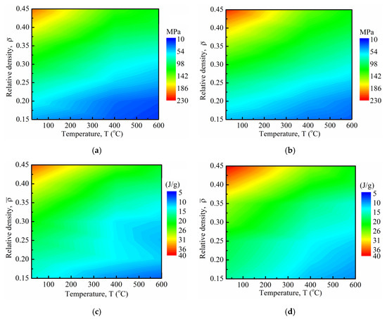 Effect of temperature and relative density on strength of (a) ST and (b) HT materials and the energy absorption capacity of the (c) ST and (d) HT materials.