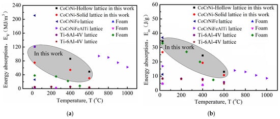 Ashby chart of energy absorption versus temperature (a) Em; (b) EV.(Adapted from Refs. [22,30,31,32,33]).