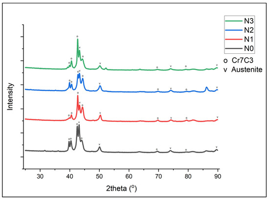 The XRD of Samples N0 to N3 is shown in Figure 1. It can be seen that the primary form of carbides was Cr7C3, along with peaks matching austenitic and martensitic structures [12].