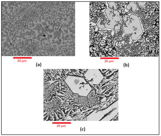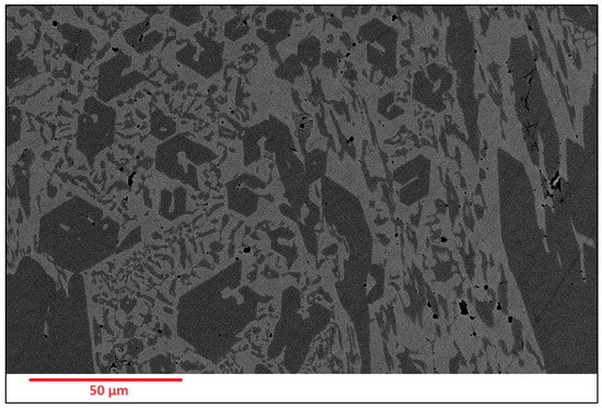 From these points, SEM images of potentiostatically etched alloys are shown in Figure 9, Figure 10, Figure 11 and Figure 12. EDS was carried out for the primary carbides and austenite to evaluate the potential changes in composition post etching. These compositional results are shown in Table 11 and Table 12. Notably, the composition of the carbides did not appear to significantly change throughout potentiostatic etching, with detected elements all lying within ~3% of each other. However, oxygen appears to significantly increase within the austenite for all alloys when etched at 800 mV to ~35 wt%, whereas this was previously undetected when etched at −330 mV. This suggests the growth of products such as oxides.