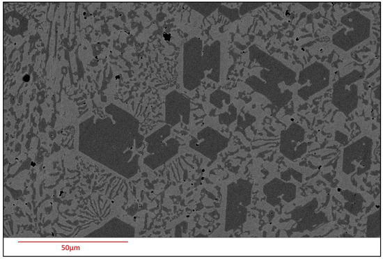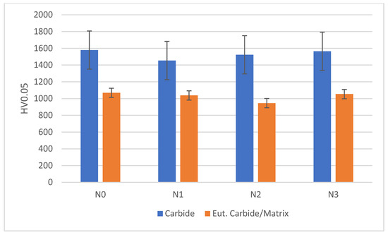 Hardness of chromium carbides and a eutectic carbide/austenite mix was measured using 0.05 kg load. The hardness of a mixture of the eutectic carbide/austenite area was taken due to difficulty in carrying out indentation separately on each phase. Hardness was evaluated using an average of three different points, as shown in Figure 6.