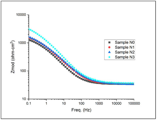 Bode plot with respect to magnitude for Alloys N0, N1, N2, and N3.