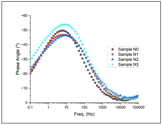 The Bode plots presented in Figure 14 and Figure 15 offer complementary insights into the Nyquist plots and further elucidate the electrochemical behaviour of the high-chromium white iron alloys. Figure 14 displays the magnitude of impedance |Z| as a function of frequency. At high frequencies (>103 Hz), all alloys exhibit similar low impedance values, primarily representing the solution resistance. As the frequency decreases, the impedance increases, with clear differences emerging among the alloys. In the mid-frequency range (1 to 103 Hz), the slopes of the curves provide information about the capacitive behaviour of the electrode–electrolyte interface. Notably, Alloy N3 shows the steepest slope, followed by N2, N1, and N0, indicating an increasing capacitive character with higher nitrogen content. This aligns with earlier observations of improved passive film formation in nitrogen-rich alloys.
