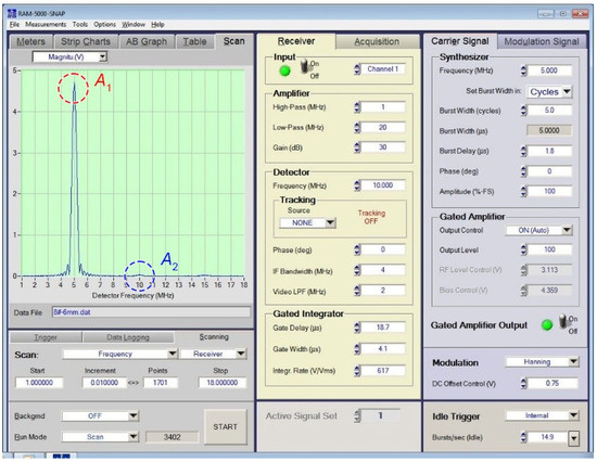 According to Equation (7), the second order acoustics nonlinear coefficient of the material can be obtained through the Fast Fourier transform (FFT) transformation of the experimentally measured time domain received signal. Subsequently, the amplitudes A1 and A2 of the fundamental wave and the second harmonic in the received signal can be determined. To minimize the influence of ultrasonic near-field effects, the secondary reflected echo from both the lower and upper surfaces of the specimen was selected for measuring the second order acoustics nonlinear coefficient. The frequency scan range of the received signals begins at 1 MHz and extends up to 20 MHz. Each received signal file comprises approximately 1200 data points, providing detailed information at various frequencies. Additionally, a post-averaging process was applied to the harmonic signals to enhance stability. This process ensures that the measured values accurately reflect the overall level of the nonlinear effect present in each plastically deformed specimen. Through post-averaging, the values are smoothed and become more consistent, thus improving the reliability of the results. To reduce the testing error, each sample was measured three times. Figure 4 illustrates one of the frequency spectrum curves of the received signal of the Group A4 specimen, highlighting the features of received signal.