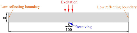 The fourth-order Lagrange element was used in the FE model. To ensure the convergence of calculation, each wavelength should contain at least approximately 1.5 grid elements [32]. The wavelength of an ultrasonic longitudinal wave in steel is approximately 1.2 mm, so the grid size of finite element model elements is selected as 0.8 mm. According to the Fourier or von Neumann stability analysis [33], the time step, Δt, should be smaller than the time required for the longitudinal wave to travel across the element length, which is expressed as: