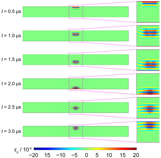 where cL is the longitudinal wave velocity in steel and Δy is the length of element. The material parameters used in the calculation were = 195 GPa, μ = 82 GPa, υ = 0.3, b = 2.5 nm, L = 23 nm, and the conversion factors Ω and R were chosen as 0.33 [34]. The edge dislocation and the screw dislocation were assumed to each make up half of the total dislocations. Figure 6 shows the propagation of the ultrasonic wave in the specimen when the plastic strain ε = 0.112.
