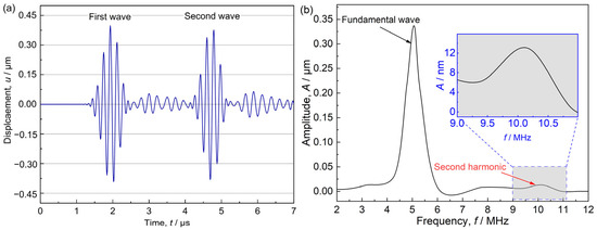 The first wave is the signal that the transmitted signal directly reaches the receiving probe on the bottom edge, while the second wave is the signal that the transmitted signal reaches the receiving probe after being reflected once each from the bottom and top edges of the specimen, respectively. The Hanning window is used to intercept the second wave (t = 4–5.5 μs) of the received signal in Figure 7a, and then the Fast Fourier transform (FFT) was performed on this signal to obtain the spectrum distribution of the received signal. It can be seen that due to the nonlinear stress–strain relationship of the material, the second harmonic at 2f0 frequency is generated in the received signal.